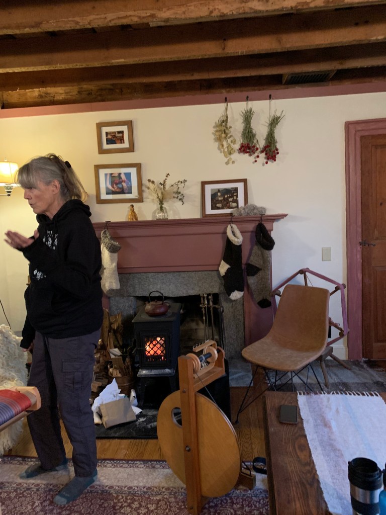 The Open Studio idea is a great one, giving you time not only to do a little holiday shopping, but time to settle in for a while and catch up with friends and projects. I was so excited to see so many of the people I’d met at Heather’s spinning sessions in the summer. Both Erica Burrows (above left, knitting) and Judith Hooper (left here) were there (I’ve mentioned them in previous posts) as well as Sharon Geyer (shown above weaving) who bought my Ladybug Wheel. Just at the end, another knitter/spinner breezed in, and I failed to get a photo of Kate’s awesome color work sweater (a 3-year project finally completed.